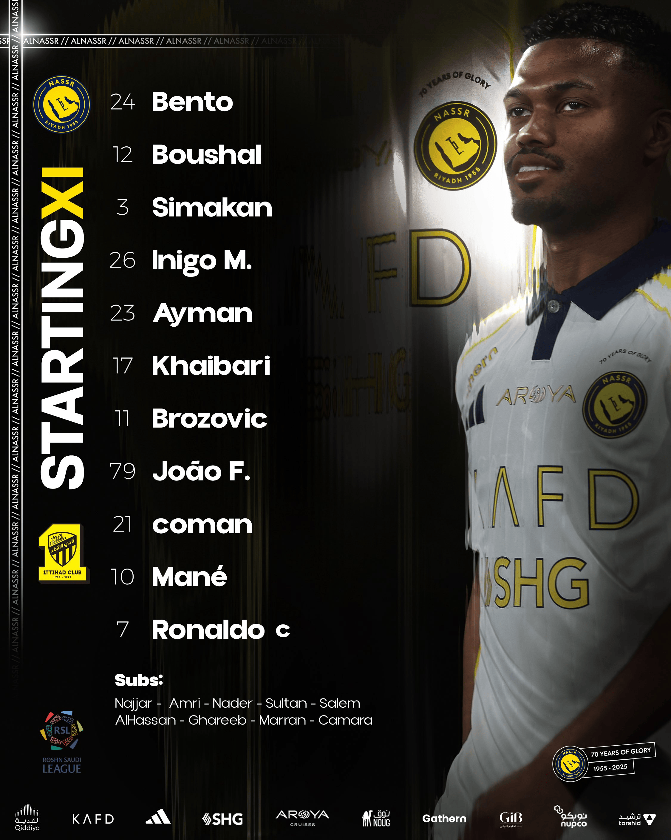 吉達聯(lián)合首發(fā):1-拉伊科維奇、6-薩阿德-穆薩、2-達尼洛、32-朱勒丹、42-穆阿特、8-法比尼奧、7-坎特、10-奧亞爾、19-迪亞比、34-貝爾溫、9-本澤馬
