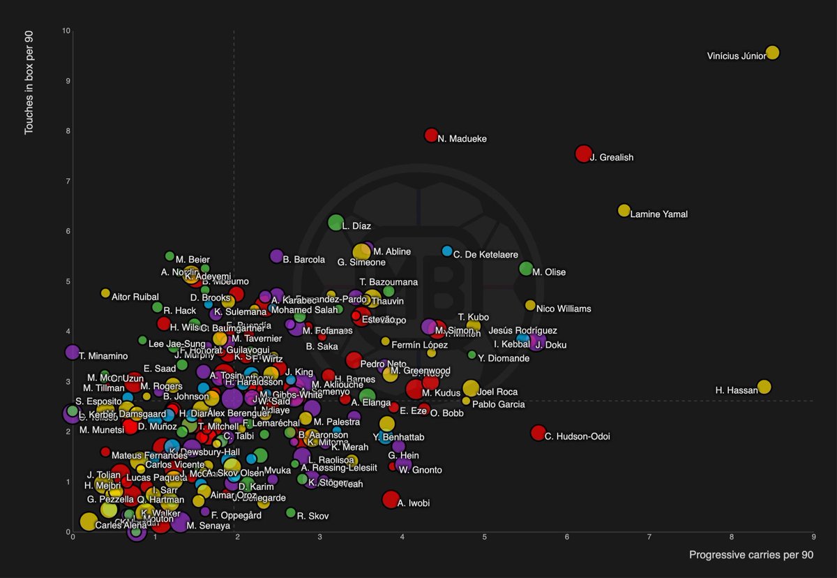 從圖中可以看出,斯本賽季賽禁維尼修斯位于最右上角的大聯(lián)多位置,領先格拉利什等人相當明顯。區(qū)觸球推球