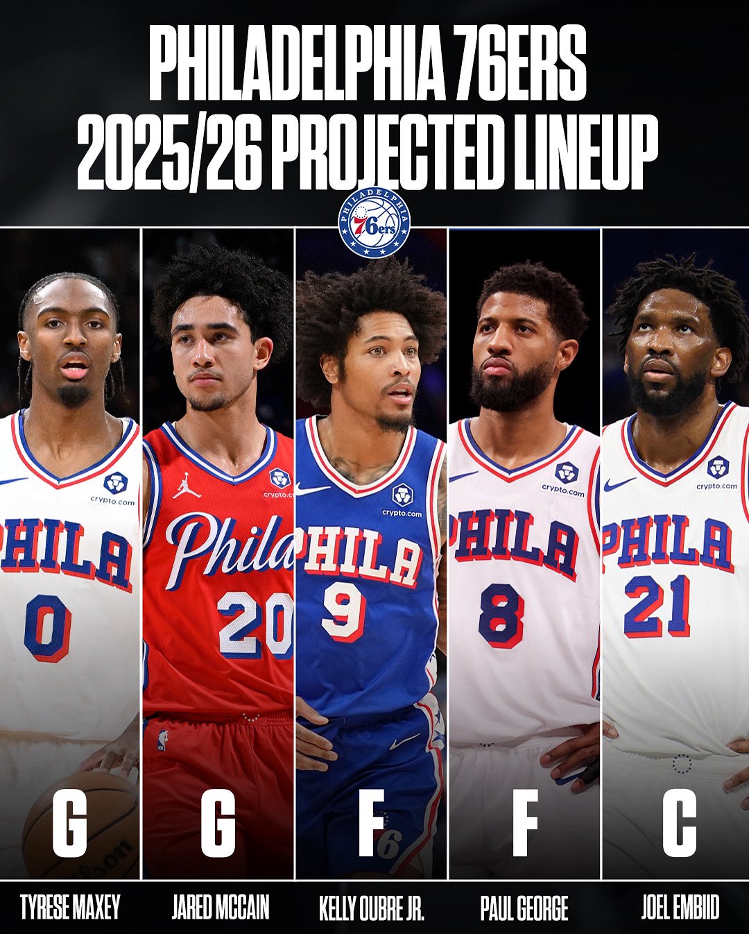 圖中的流言力堅(jiān)五名球員分別是:泰雷西-馬克西,賈里德-麥凱恩,凱利-烏布雷,保羅-喬治和喬爾-恩比德。